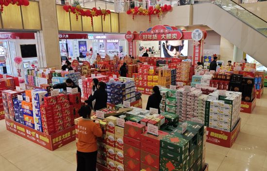 同日,延吉百貨大樓節(jié)日裝飾喜慶亮眼,新春氛圍感拉滿。一樓大廳內(nèi),特意設(shè)置了年貨專區(qū),堅果、糖果、海產(chǎn)品、酒水禮盒整齊陳列,延邊特色產(chǎn)品、全國名優(yōu)好物應(yīng)有盡有,從家庭自用到走親訪友的禮盒套裝,再到日常餐桌的生鮮食材,品類豐富、一應(yīng)俱全。“現(xiàn)在都提倡健康生活,多買點水果、海產(chǎn)品,老人孩子都愛吃,禮盒送禮也體面,趁著優(yōu)惠多買點!笔忻駝⑴亢图胰苏奶暨x著干果禮盒與生鮮商品。