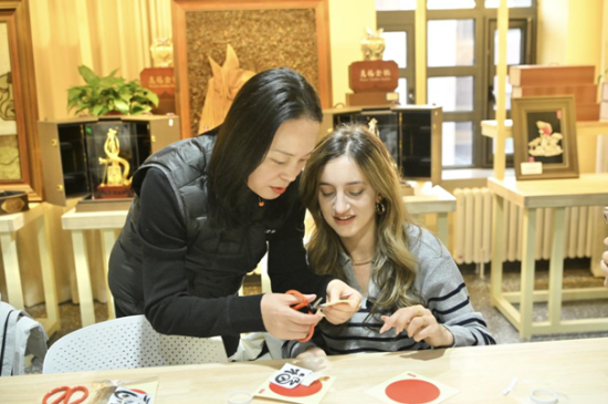 美國自媒體博主于中美按照吉林省查干湖魚皮制作技藝傳承人徐毳的指導(dǎo),一步步剪完了魚皮畫,她舉著自己的作品說:“我是第一次了解魚皮畫,沒想到魚皮能做成這么精美、這么美麗的藝術(shù)品!