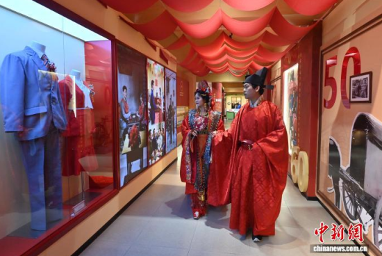 11月7日,偽滿皇宮博物院主辦的《天配良緣——近現(xiàn)代婚戀婚俗實(shí)物展》于長(zhǎng)春開幕。展覽通過(guò)婚書、嫁妝等300余件民間實(shí)物,帶領(lǐng)參觀者沉浸式感受不同年代的婚禮婚俗,F(xiàn)場(chǎng)通過(guò)漢服走秀、嗩吶演奏等演出,展現(xiàn)傳統(tǒng)婚儀魅力。中新社記者 張瑤 攝