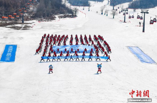 吉林中旅松花湖雪場(chǎng)的滑雪方陣展示長(zhǎng)春大冬會(huì)吉祥物!∈橛 攝