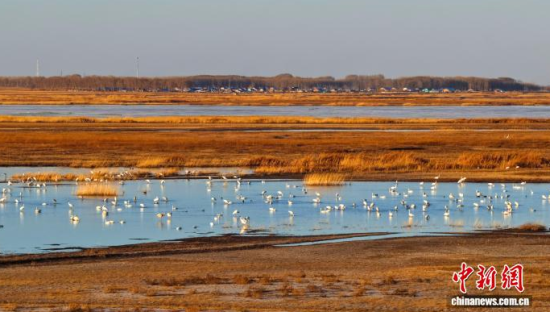 4月11日,吉林鎮(zhèn)賚,白鶴等珍稀鳥類在莫莫格濕地覓食!∨岁申 攝