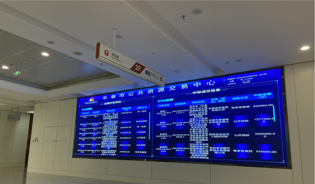 在長(zhǎng)春市政務(wù)服務(wù)中心二樓,記者看到,這里設(shè)有開標(biāo)室、澄清室等多個(gè)功能區(qū)域,LED屏幕實(shí)時(shí)滾動(dòng)著政府采購(gòu)近期開標(biāo)項(xiàng)目和中標(biāo)成交信息,方便企業(yè)人員隨時(shí)查看、跟蹤項(xiàng)目進(jìn)展。