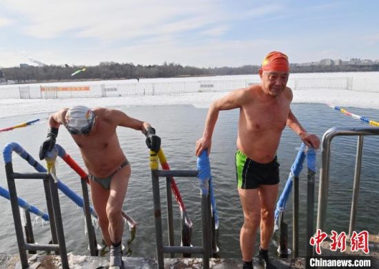 2月19日,在長春南湖公園,吳長海(右)準(zhǔn)備和泳友一起冬泳。今年85歲的吳長海堅(jiān)持冬泳已有三十余年,冬泳已成為他每天生活中必不可少的一件事。當(dāng)天長春氣溫達(dá)零下17攝氏度,吳長海說,冬泳使他身體強(qiáng)壯,以后會(huì)堅(jiān)持下去。中新社記者 張瑤 攝