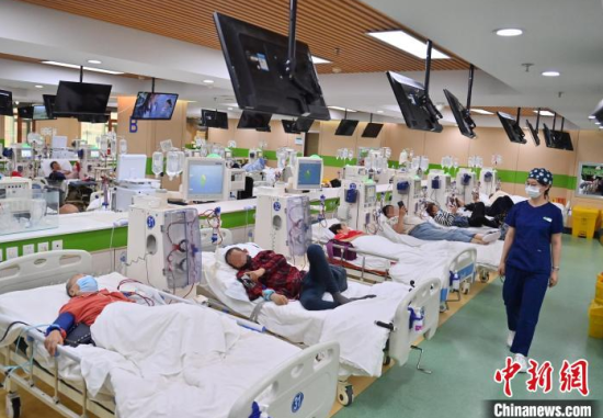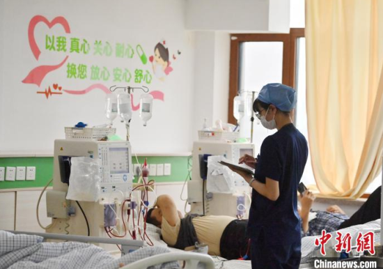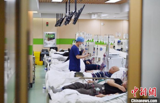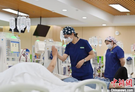 5月9日,長春中醫(yī)藥大學(xué)附屬醫(yī)院腎病科透析室內(nèi),護(hù)士在為患者進(jìn)行透析治療。該科室日均接診近200名患者,每位患者的透析過程都需要數(shù)小時(shí)。治療期間,護(hù)士們會(huì)全程密切監(jiān)測(cè)患者生命體征,隨時(shí)準(zhǔn)備應(yīng)對(duì)突發(fā)狀況。多年來,醫(yī)護(hù)團(tuán)隊(duì)以專業(yè)的技能和細(xì)致的關(guān)懷,持續(xù)為患者的生命健康保駕護(hù)航。中新社記者 張瑤 攝