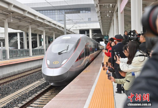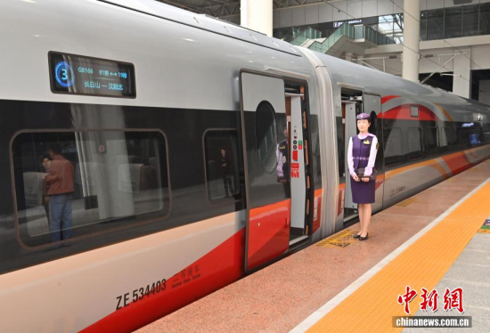 9月28日,G8166次列車從長(zhǎng)白山站始發(fā),駛向終點(diǎn)站沈陽(yáng)北站,沈白高鐵正式開通運(yùn)營(yíng),結(jié)束了吉林省通化、白山兩市不通高鐵的歷史,北京朝陽(yáng)站、沈陽(yáng)北站至長(zhǎng)白山站的最短旅行時(shí)間分別為4小時(shí)33分、1小時(shí)53分。作為中國(guó)東北高鐵網(wǎng)重要組成部分,該線路對(duì)暢通區(qū)域經(jīng)濟(jì)循環(huán)、促進(jìn)沿線旅游資源開發(fā)等具有重要作用。中新社記者 張瑤 攝