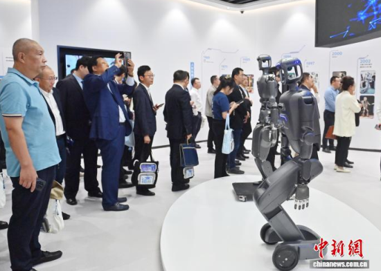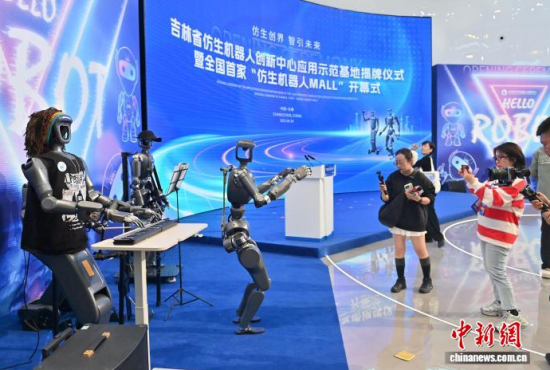 9月30日,吉林長(zhǎng)春,參觀者觀看科技文旅機(jī)器人。當(dāng)天,吉林省仿生機(jī)器人創(chuàng)新中心應(yīng)用示范基地于吉林省長(zhǎng)春市揭牌,全國(guó)首家“仿生機(jī)器人MALL”也在同期開幕。該基地集展示、體驗(yàn)、科普、銷售等功能于一體,致力于打造沉浸式科技消費(fèi)新地標(biāo)。中新社記者 張瑤 攝