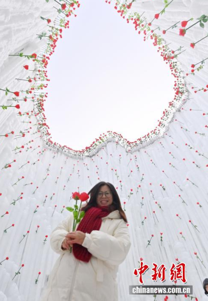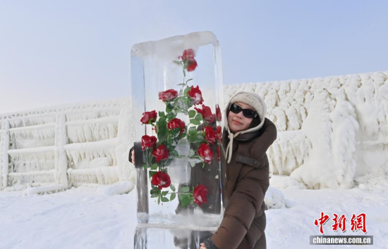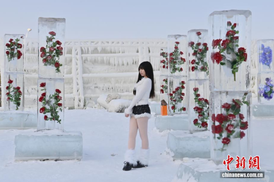 1月13日,在長(zhǎng)春云瑯冰雪公園內(nèi),一組別具匠心的玫瑰冰雪景觀吸引了眾多游客。中新社記者 張瑤 攝