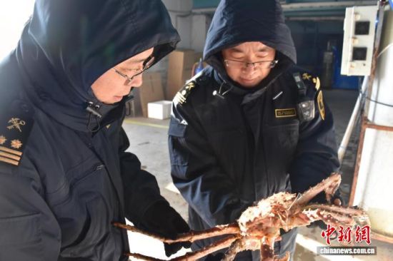 12月16日,琿春海關(guān)現(xiàn)場(chǎng)關(guān)員監(jiān)管首批通過(guò)保稅物流分撥出口的活紅帝王蟹。(長(zhǎng)春海關(guān)供圖)