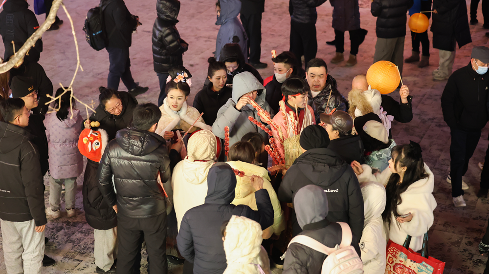 主街上人頭攢動(dòng),500個(gè)電子氦氣孔明燈正被游客陸續(xù)領(lǐng)走。這種無明火的環(huán)?顭羟颍缺A袅藗鹘y(tǒng)意蘊(yùn),又兼顧了綠色理念。孩子們用馬克筆在燈上寫下心愿,在巡游隊(duì)伍中歡快地奔跑。冰雕糖葫蘆、轉(zhuǎn)運(yùn)祈福墻、漢服巡游……一個(gè)個(gè)精心設(shè)計(jì)的打卡點(diǎn),讓整條老街成為國風(fēng)出片的天然影棚。