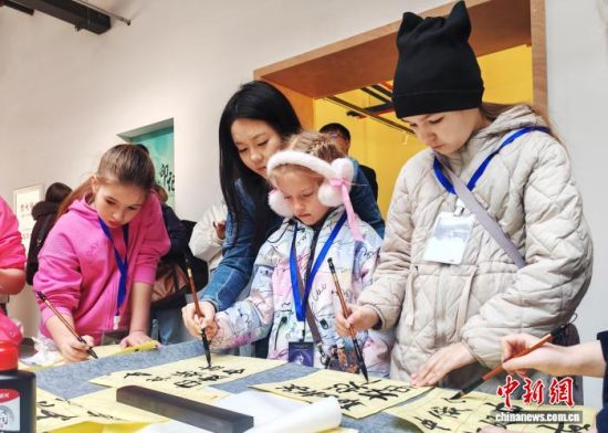 俄羅斯青少年在體驗(yàn)書法。李彥國 攝